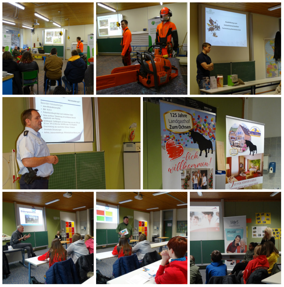 Zusammen mit unseren Partnern in der Berufsorientierung, der Industrie- und Handelskammer und der Bundesagentur für Arbeit, sind Vertreter der Betriebe in der Region unserer Einladung gefolgt und haben in eindrücklichen Vorträgen und praktischen Vorführungen mit berufstypischen Geräten den Schülerinnen und Schülern ihren Arbeitsbereich praxisnah vorgestellt.