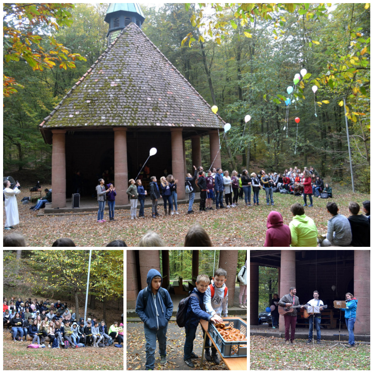Bei schönem, trockenem Herbstwetter wanderten die knapp 300 Schüler und Schülerinnen der Wasgau Realschule Plus am 19.10.18 von Hauenstein aus auf den Winterberg, um dort einen ökumenischen Dankgottesdienst zu feiern. Warum der Ort Winterberg und das Kirchlein Winterkirchel heißt, erfuhren die Kinder hautnah, denn zu der frühen Stunde ließ sich die Herbstsonne zunächst noch nicht blicken und es war einigen doch recht kalt dort oben. In einer kurzen Vorstellung des Winterkirchels erfuhren die Schüler einiges Wissenswertes, das sie dann doch erstaunte. Besser verstanden die Jugendlichen dadurch, dass vielen älteren Menschen dieses kleine Kirchlein im Wald am Herzen liegt und ein besonderer Ort ist.