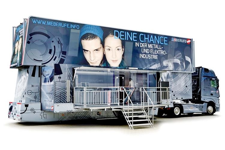 Der Info-Truck liefert Berufsinformationen der Metall- und Elektro-Industrie. Ganze Klassen erhalten die Möglichkeit, sich über Ausbildungschancen und Berufsbilder zu informieren. In einer Unterrichtseinheit von etwa 90 Minuten können die Schülerinnen und Schüler auf insgesamt 75m2 an unterschiedlichen Arbeitsplätzen praktische Erfahrungen sammeln. Interaktive Angebote ergänzen die Einblicke.